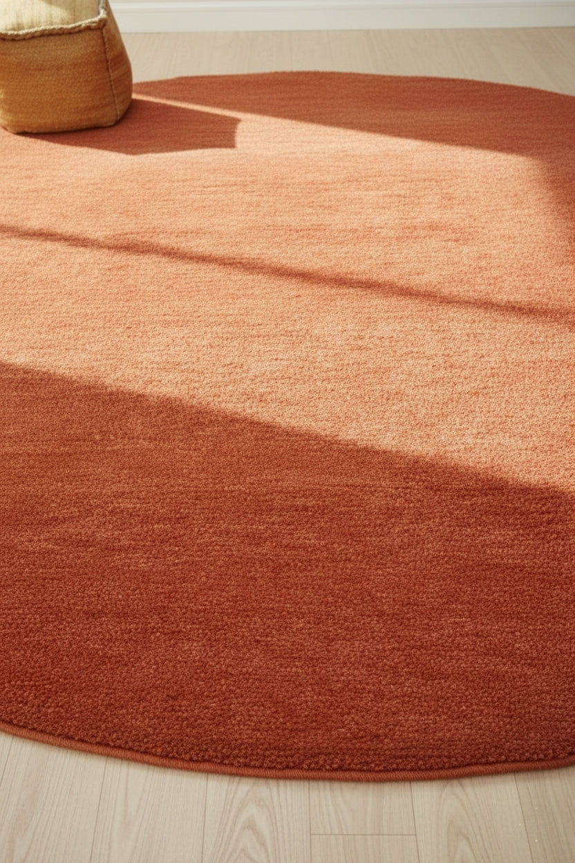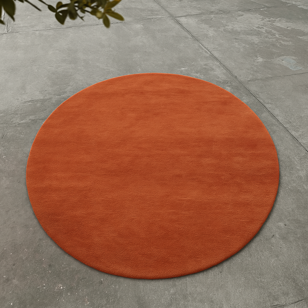 A rich rust copper round carpet handcrafted from premium New Zealand wool. Hand-loom woven for a smooth, dense finish—perfect for modern, warm, and statement interiors.